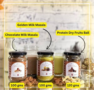 Indulge in the perfect blend of Golden Milk Masala, Chocolate Milk Masala, & Protein Dry Fruits Ball!