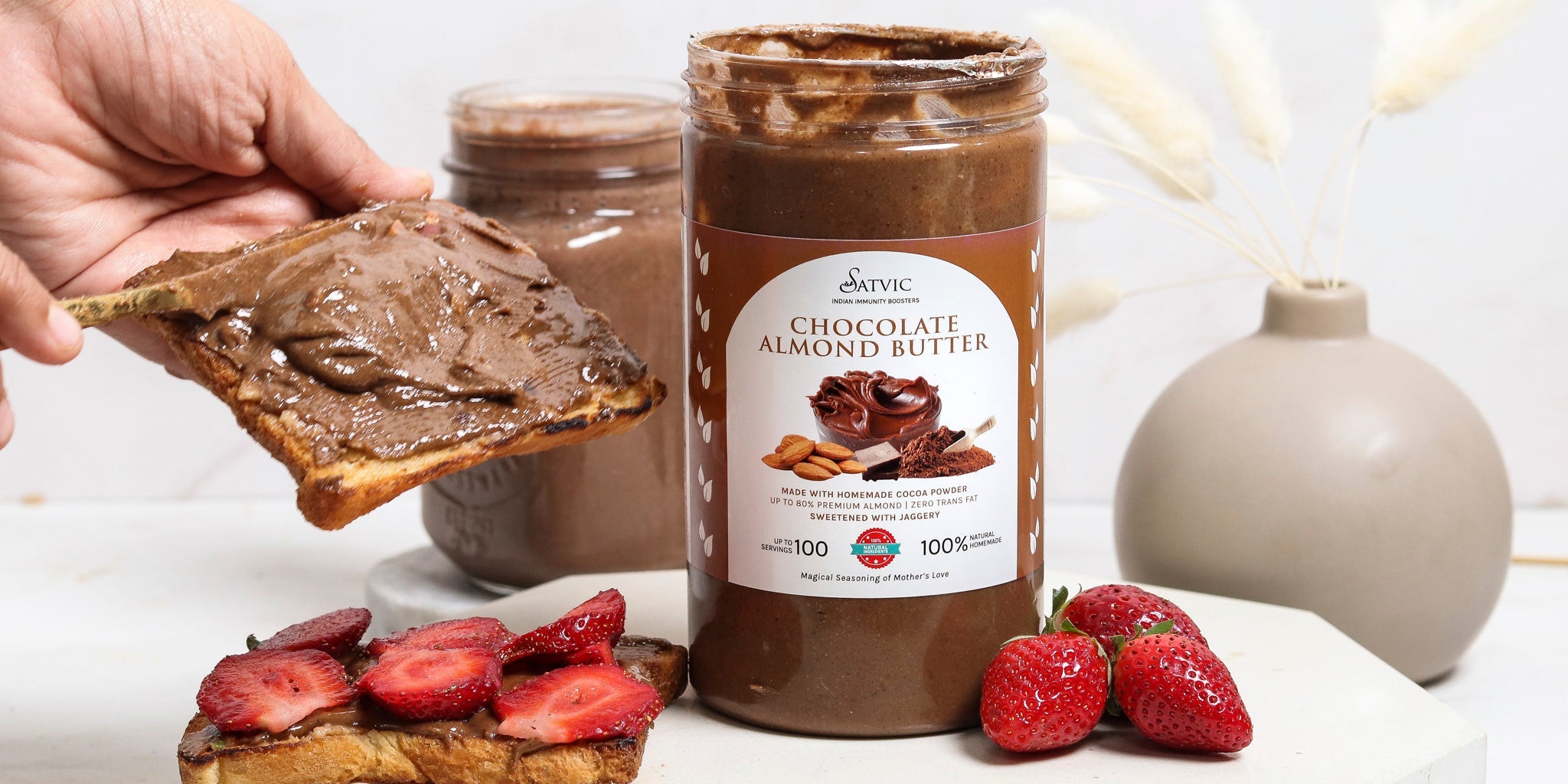 Looking for a tasty yet healthy snack option? Try Satvic Foods' Chocolate Almond Butter, made with 80% premium almonds and other wholesome ingredients.