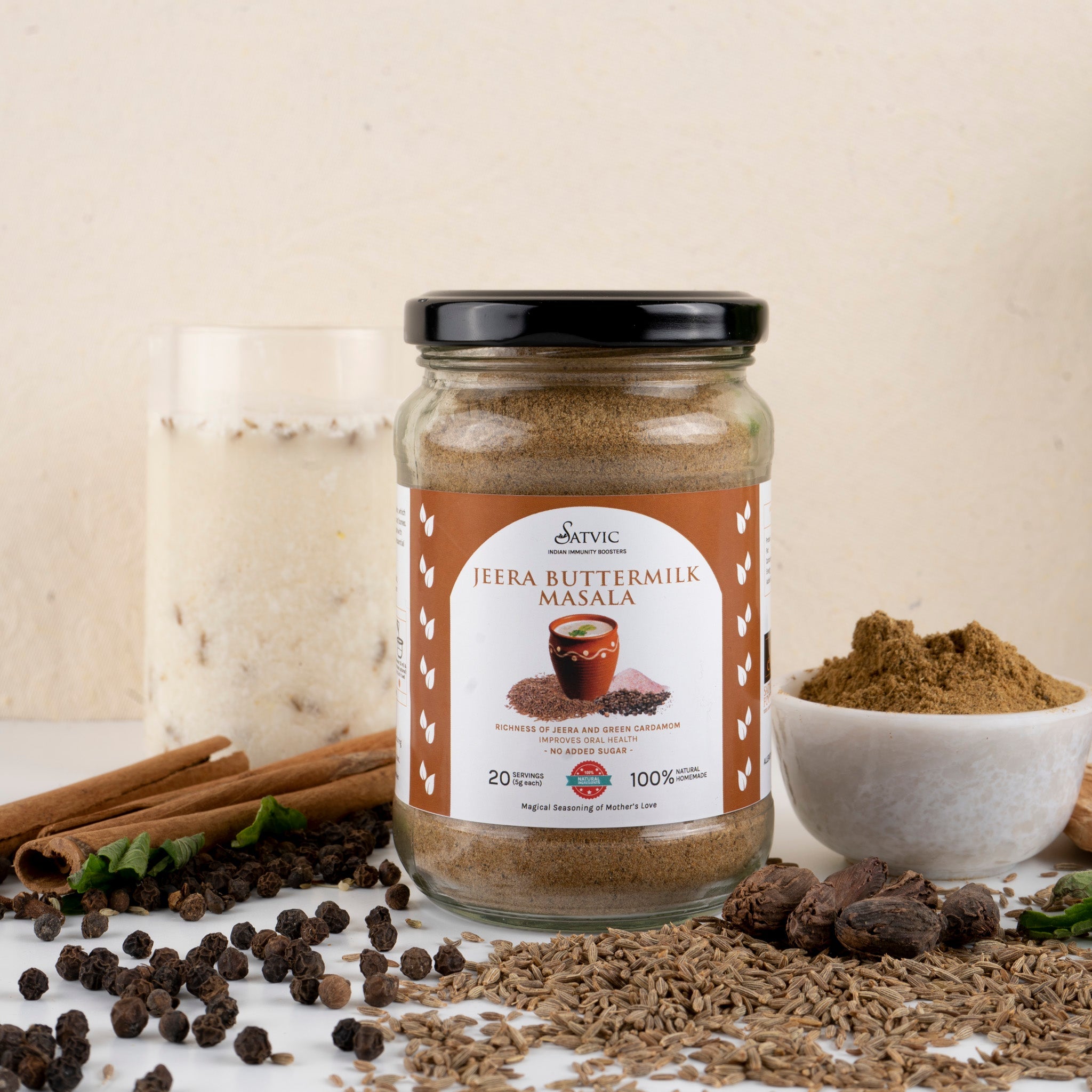 Satvic Foods' Jeera Buttermilk Masala is a perfect blend of carefully chosen ingredients that not only enhance the flavor but also provide numerous health benefits.