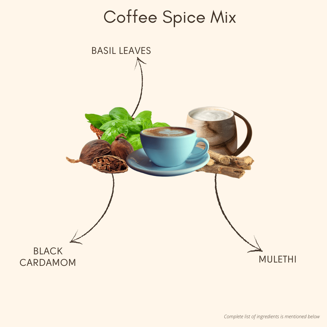 Coffee Spice Mix is a perfect combination of strong coffee and sweet essence of spices, like Licorice (Mulethi), White Pepper, Star Anise, White Pepper, and others. This rich blend of Indian spices with your grounded coffee makes your beverage even more stimulating.